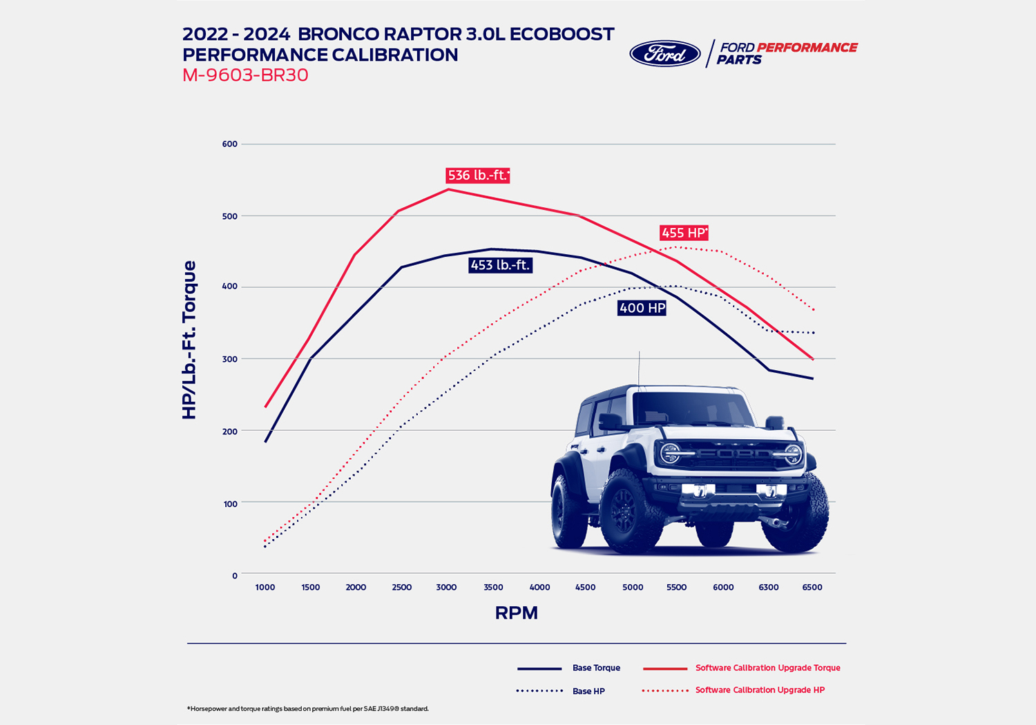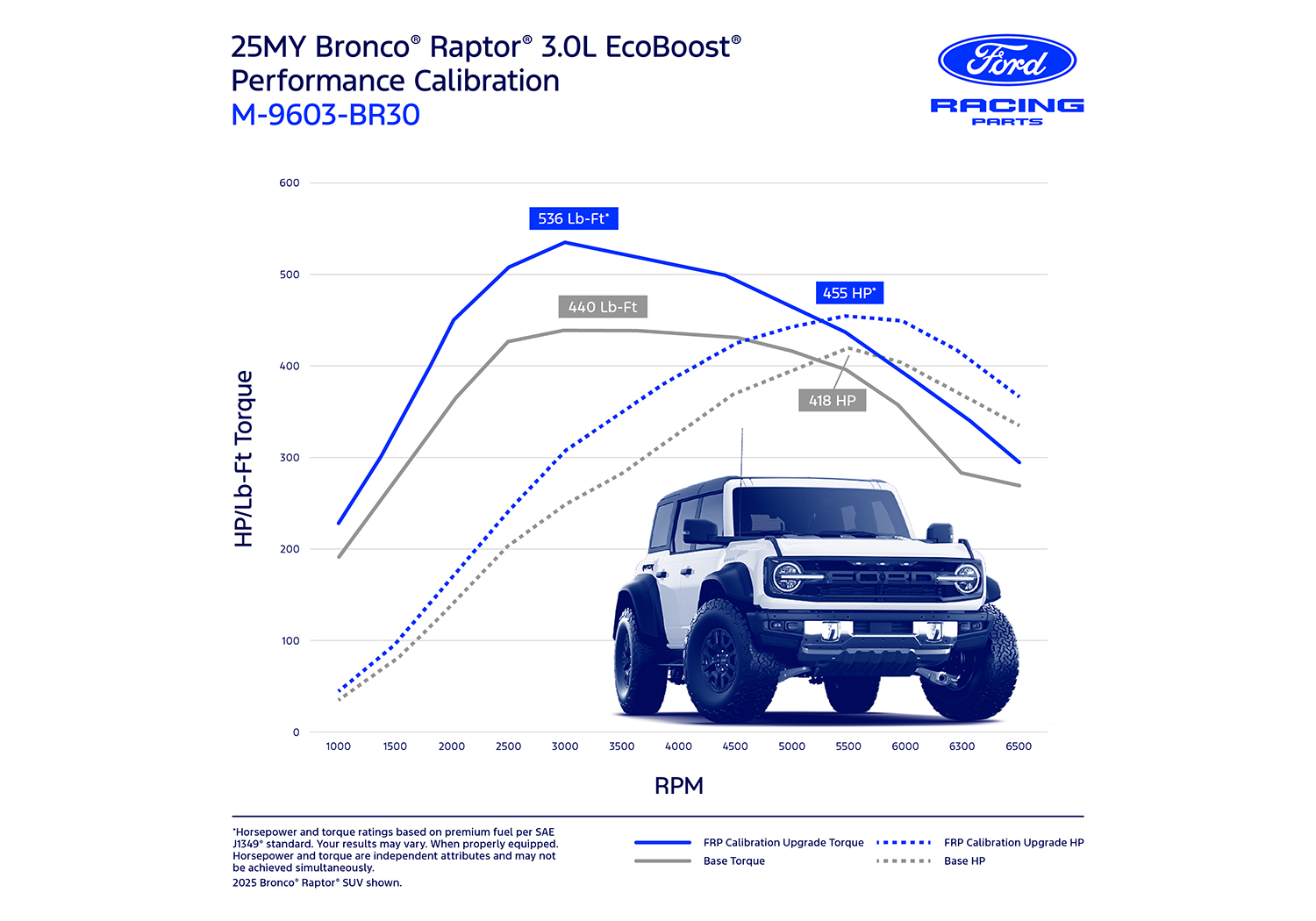 Enhance the performance of the 3.0L EcoBoost engine in your 2022-2026 Bronco Raptor. Ford Racing Parts calibrations are engineered and dyno tested to deliver more power and increased performance while maintaining reliability.